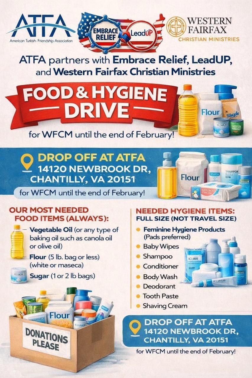 Join us in supporting the community! ATFA partners with Embrace Relief, LeadUP, and Western Fairfax Christian Ministries for a Food & Hygiene Drive. Help those in need by donating food and hygiene items until the end of February. Food Items (Always Needed): Vegetable Oil (any type of baking oil such as canola oil or olive […] |